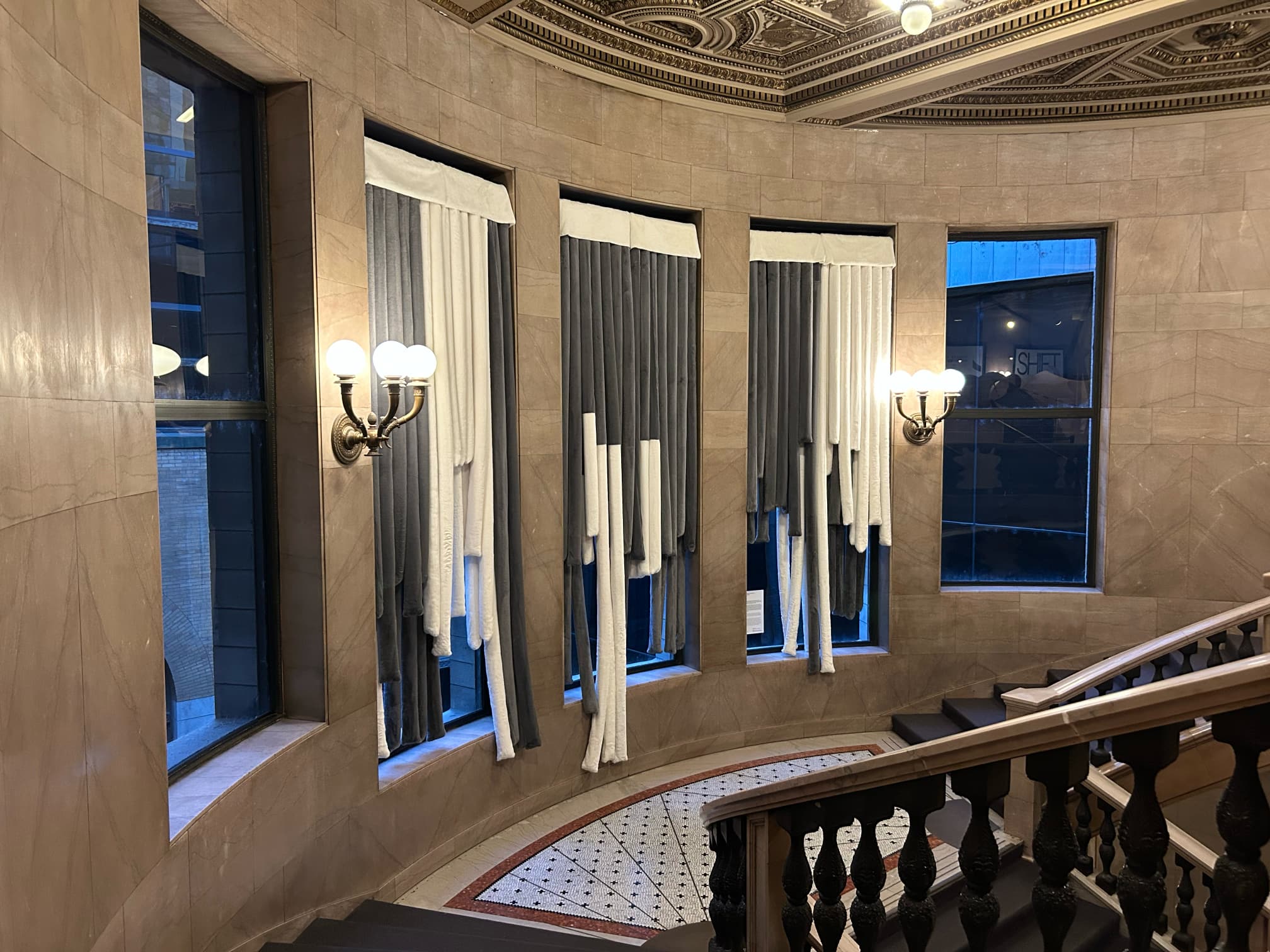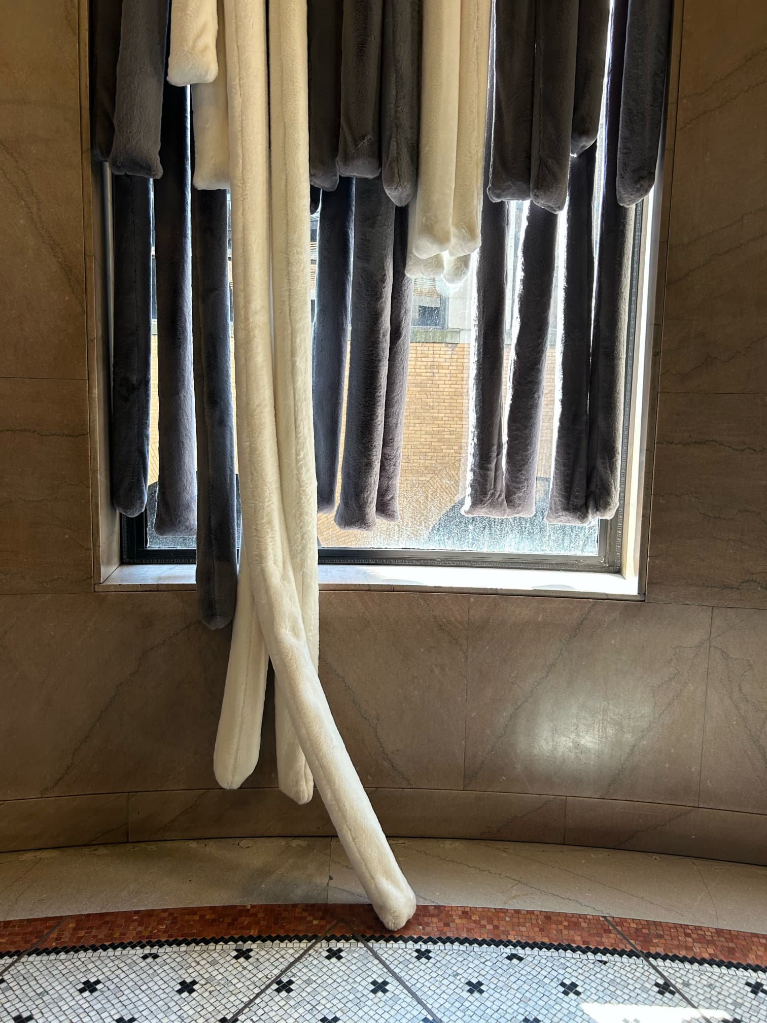This installation features oversized soft drapes made from faux fur, industrial netting, and padded materials. Positioned along a key circulation path, the curtains transform the space into an immersive environment that invites visitors to slow down and engage their senses.