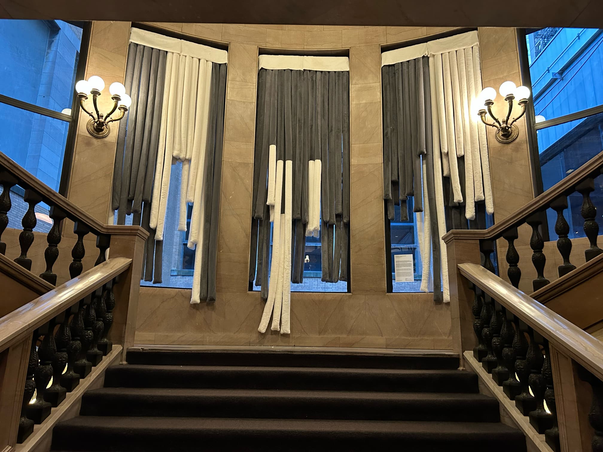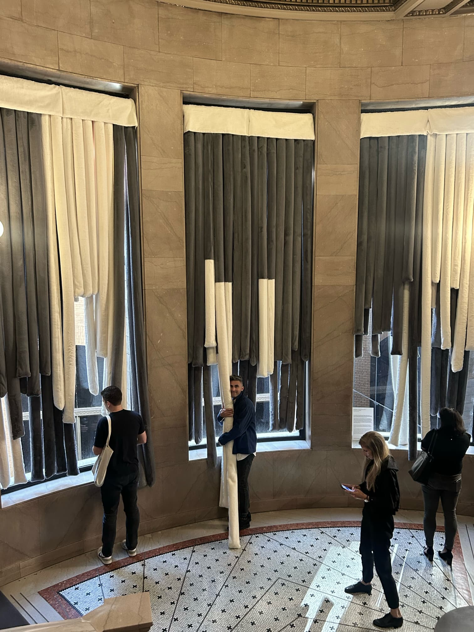 This installation features oversized soft drapes made from faux fur, industrial netting, and padded materials. Positioned along a key circulation path, the curtains transform the space into an immersive environment that invites visitors to slow down and engage their senses.